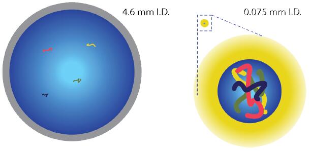 連接管的另一個(gè)重要方面是管路內(nèi)徑。納升級(jí)液相色譜 (20 μm) 的連接管內(nèi)徑大約比常規(guī)管路內(nèi)徑小10 倍。通常,毛細(xì)管級(jí)和微流速液相色譜分別采用內(nèi)徑為50μm 和 75 μm 的連接管。