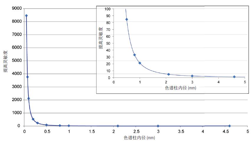 圖2. 一系列內(nèi)徑的色譜柱相較于內(nèi)徑為4.6 mm 的色譜柱靈敏度的相對(duì)提高倍數(shù)