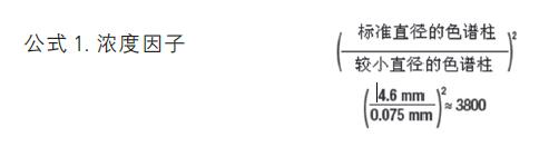 圖1 顯示了在內(nèi)徑分別為4.6 mm 和 75 μm 的色譜柱上注入相同進(jìn)樣量(四條“肽”),顯然后者的濃度更高些。相對(duì)增加的靈敏度可以采用公式1 計(jì)算。