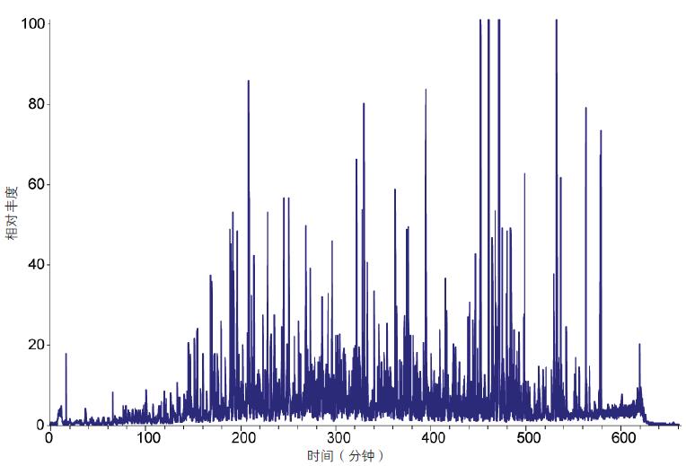 圖4. 在75 μm(內(nèi)徑)×50 cm 的納升級(jí)液相色譜柱上經(jīng)10 小時(shí)梯度洗脫后高分辨率分離的大腸桿菌消化物