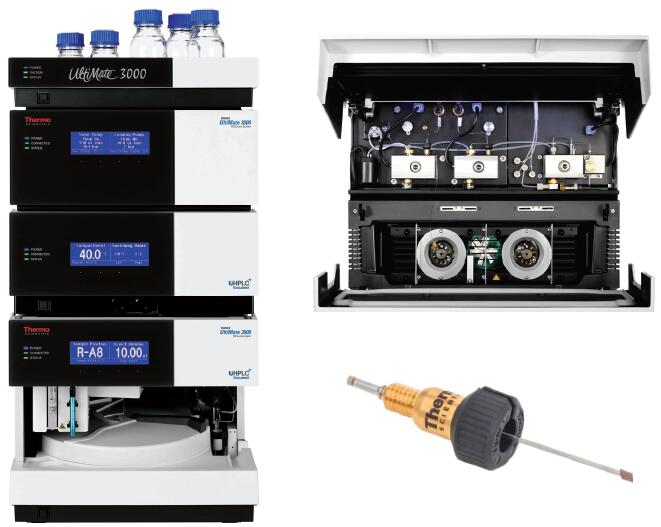 Thermo ScientificTM DionexTM UltiMateTM 3000 RSLCnano 系統(tǒng)(圖3)旨在為現(xiàn)代納升液相色譜提供所需的非常低的流速和非常高的壓力。UltiMate 3000 RSLCnano 系統(tǒng)在UHPLC 壓力條件下,提供的流速可低至20 nL/min*、高至50μL/min,使其成為可實(shí)現(xiàn)納升級(jí)、毛細(xì)管級(jí)和微流速液相色譜分析的完美儀器。1 模塊具有內(nèi)置柱溫箱,可支持一系列應(yīng)用,同時(shí)可最大限度地縮短各種元件之間的物理距離。這可使連接管盡可能地縮短。