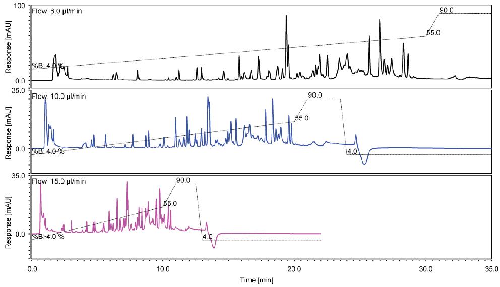 以下微流速示例對(duì)生物制藥行業(yè)中高效率和高通量肽譜圖匹配應(yīng)用特別適用。在這個(gè)特定例子中,首先以6 μL/min 流速通過30 分鐘梯度洗脫分離單克隆抗體消化物。在兩個(gè)連續(xù)步驟中,流速升高至15μL/min,同時(shí)梯度縮短。圖6 顯示了在不降低數(shù)據(jù)質(zhì)量的情況下分析時(shí)間如何縮短到1/3。以類似的方式提高標(biāo)準(zhǔn)粒徑填料液相色譜柱上的流速,可能會(huì)使色譜系統(tǒng)與質(zhì)譜儀的連接變得復(fù)雜,并需要每日更換兩次流動(dòng)相。