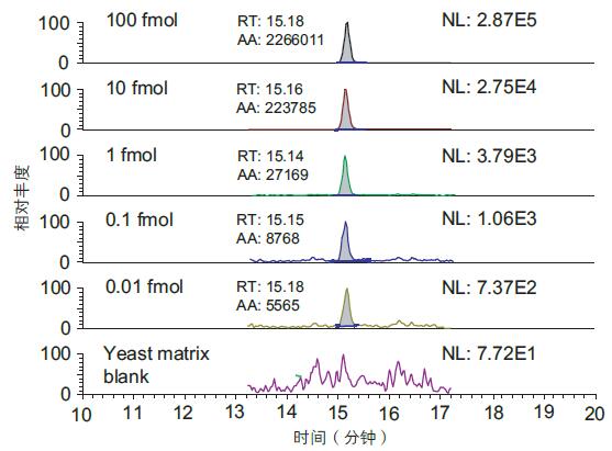 下一個(gè)例子是毛細(xì)管級(jí)液相色譜在目標(biāo)定量工作流程中的應(yīng)用。在本例中,選擇毛細(xì)管級(jí)液相色譜來增加通量、提高耐用性和易用性,同時(shí)保持很高的靈敏度。在內(nèi)徑為300 μm 的色譜柱上分離出添加同位素標(biāo)記肽的酵母消化物。樣品在30 分鐘內(nèi)以流速4μL/min 被分離,并連接到采用標(biāo)準(zhǔn)HESI-II 接口的Thermo ScientificTM TSQ VantageTM 三重四極桿質(zhì)譜儀,在SRM 模式下進(jìn)行檢測(cè),檢測(cè)限達(dá)到10 amol(圖5)。更多詳情可參閱Thermo Scientific 的應(yīng)用報(bào)告583。3