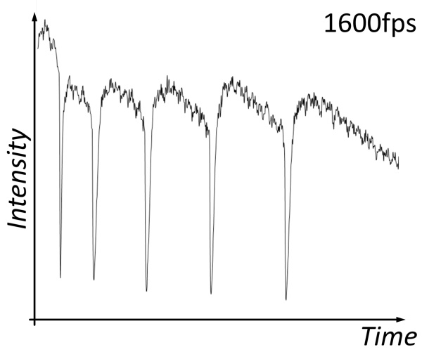 在上圖中,肉眼是看不到神經(jīng)元胞體因膜電位變化而產(chǎn)生的熒光信號(hào)變化的;但是在高速成像下經(jīng)過(guò)對(duì)圖片灰度的時(shí)間分析,就能看到1ms時(shí)間尺度內(nèi)熒光的快速變化了。