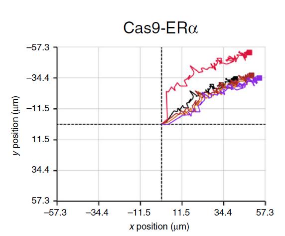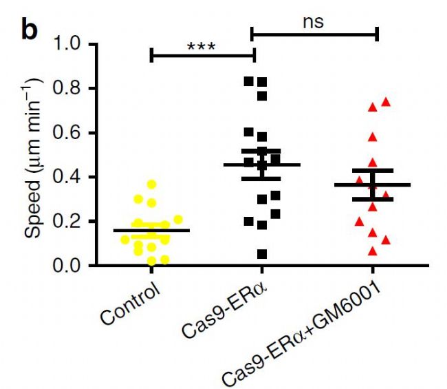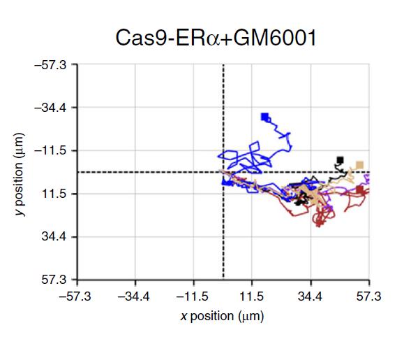 以MCF-7乳腺癌細胞株為實驗材料,使用基因編輯技術處理后的Cas9-ERα,基質金屬蛋白酶抑制劑MG6001處理的后的Cas9-ERα+ERα,以及 Cas9-vinculin,使用瑞典的HoloMonitor M4進行拍攝細胞的運動和遷移,觀察4小時,每2min拍攝一次。對比不同實驗組的細胞遷移運動情況。