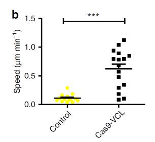 實驗結果,對比于對照組發現Cas9-ERα的細胞遷移性明顯增高,并分別捕捉到細胞變形過程中的五種不同形態,(文章補充材料中1-5movie)。并且在Cas9-ERa+MG6001該實驗組中金屬蛋白酶抑制劑并沒有能抑制細胞缺少ERα后的高侵襲性。并分析了五種不同形態的細胞百分比。Cas9-vinculin的細胞遷移及細胞運動速率同樣明顯高于對照組,同時也觀察到可細胞變形過程中的五種不同形態,(文章補充材料中6-10movie)。綜合文章數據表明了在乳腺癌細胞中,ERα的缺失會導致黏著斑蛋白(Vinculin)的表達量下降會直接導致細胞內的肌球蛋白輕鏈p-MLC的增加,從而導致細胞的侵襲性增加。