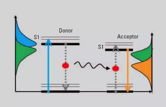 FRET(Förster resonance energy transfer,熒光共振能量轉移)發生在供體熒光分子與受體熒光分子的距離足夠近且供體的發射光譜與受體的吸收光譜相重疊時(10 nm以內)。當供體分子吸收一定頻率的光子后被激發到更高的電子能態,在該電子回到基態前,通過共振實現能量向鄰近受體分子轉移。發生FRET后,供體的熒光強度比它單獨存在時要低的多,而受體發射的熒光卻大大增強,同時供體的熒光壽命也會因FRET的發生而縮短(FLIM-FRET應用)。
