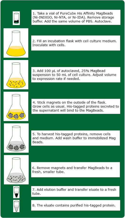 當然,新的方法能夠成功也是因為Cube Biotech所有的親和純化磁珠:NTA,IDA,和新的INDIGO系列產品都可以通過高溫蒸汽滅菌鍋處理。有興趣嘗試我們新方法用于下一次表達的His標簽胞外分泌蛋白?請參看我們如下的操作流程。