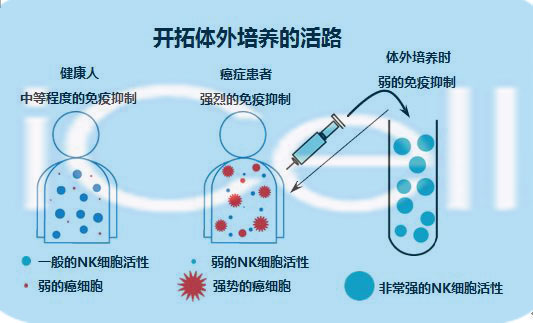 IL2因子的場合,如果在體內(nèi)不進(jìn)行大量投入的話,是沒有治療效果的,但是大量投入的副作用就是會(huì)威脅到患者的生命。因此,最好的辦法是把淋巴細(xì)胞從體內(nèi)取出來,在免疫抑制影響小的體外,用大量的IL2進(jìn)行刺激,促使NK細(xì)胞活化,然后回輸?shù)交颊唧w內(nèi)。