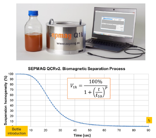 如果生物磁分離系統具有良好定義的條件(即均勻磁力),不透明度隨時間變化的曲線通常會形成“S”形。定義該曲線的兩參數指數P與時間t50分別反映曲線的斜率和分離時間達到一半時最大和最小的不透明度之間的差異。這兩個參數取決于一些源于磁珠(直徑、磁性含量%、磁性材料)和懸浮液(緩沖液粘度、磁珠濃度等)的特性。由于測量曲線的形狀受所有這些參數的影響,因此監測可以為不同的分離過程建立特定的參考數據和曲線。當固定了磁性分離條件后,同類的分離過程的驗證就應遵循相對應的參考曲線。