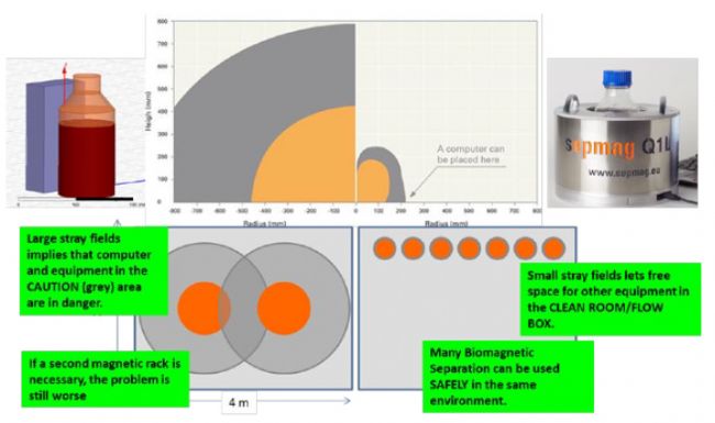 | 建議:首先,應制定安全操作規范和計算安全操作范圍:設置警戒區域和危險區域。其次,除了考慮磁分離器的分離性能外,還應注意磁分離器/架產生的雜散磁場。盡可能選擇雜散磁場小的生物磁分離系統或安全的磁性分離設備。例如SEPMAG®先進的磁性分離系統通過特殊的設計可以放置在電腦旁使用并且保護操作者遠離使用傳統大型磁鐵可能帶來的危險。這樣可以減少事故風險,同時減少危險區域,也為其他設備留出更多放置空間。 |