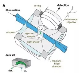 使用一層光束從樣品側(cè)面激發(fā)熒光樣品,使用CCD或sCMOS進(jìn)行檢測(cè),照明光路和熒光檢測(cè)光路互相垂直。由于樣品受激發(fā)的平面就是成像平面,不存在離焦激發(fā),可以自動(dòng)獲得光學(xué)切片,從而將光漂白和光學(xué)損傷降到最低。光片顯微系統(tǒng)使用CCD或sCMOS成像,速度通常為每秒幾十幀,甚至上百幀,所以通過(guò)在光片下移動(dòng)樣品使入射光束激發(fā)不同的平面,可以很容易又非常快速的得到整個(gè)組織的3D圖。
