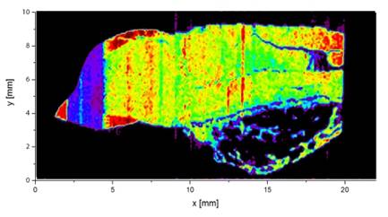 CEITEC(歐洲工程技術中心| 布爾諾科技大學)利用LIBS研究了牙齒元素分布,即Ca、Mg、P等元素的分布,樣品固定在環氧樹脂中,在感興趣的平面上切割(圖1)做LIBS分析。在樣品表面,分析了面積為22×10 mm,分辨率為100微米。通過點陣式掃描220×100個點得到22 000個測量數據。繪制成牙齒橫切面的元素分布圖(圖2),通過牙齒截面的元素含量分布分析了動物對微量元素的吸收和及微量元素的積累,反應動物牙齒的生長過程中元素的遷移積累及牙齒結構與元素分布的關系,對元素與生理健康的研究提供了一個新的完美工具。