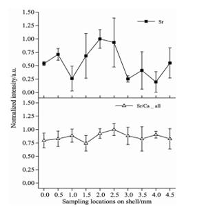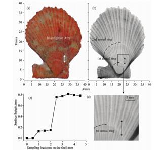 圖2牙齒中Ca顯微成像貝類生物作為無脊椎軟體動物的代表在寒武紀早期即已出現, 具有儲量多、分布廣、 不易遷移等特點,且地域特征明顯,被視為監測生態系統的理想“生物標識器”廣泛用于海洋研究。在貝類生長過程中,貝殼會形成類似“樹輪”一樣疏密不一的生長線,記錄周邊環境變化及食物結構的變,具體到季度、月的生長周期,其生長線(層)的厚度僅為微米量級,相應的成分元素含量也呈現出微米量級的空間分布。
