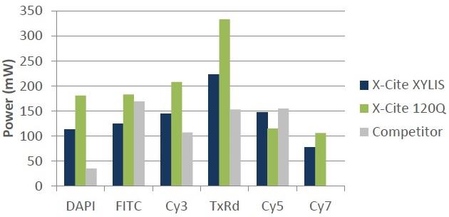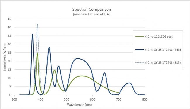 氙燈和汞燈做為白光源,都能提供從紫外到近紅外一系列波長的光,但它們卻有著不同的激發光譜。汞燈集中在近紫外、藍光以及綠光附近,這種在峰值的高激發能量確保產生明亮的熒光信號,但光毒性卻很強。因此,HBO用來對固定樣品或弱熒光成像。相比而言,氙燈光源的激發比較平緩,可以用于不同波長間強度的比較,例如用于鈣離子濃度測量等。氙燈的強激發在近紅外800-1000nm。