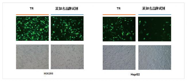 左圖為我司TR轉染試劑與市面常用的知名品牌轉染試劑在轉染HEK293細胞時的對比實驗,實驗結果表明,我司TR的轉染效率要明顯超過品牌試劑轉染效率;