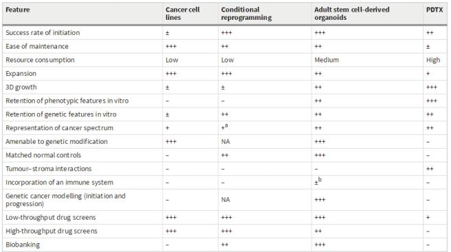 1. Respective features were judged as best (+++), suitable (++), possible (+), not very suitable (±) or unsuitable (-). NA, not available; PDTX, patient-derived tumour xenograft.