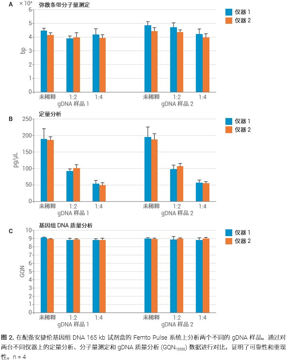 在配備安捷倫基因組 DNA 165 kb 試劑盒的 Femto Pulse 系統(tǒng)上分析兩種不同的 gDNA 樣品。在兩臺不同的 Femto Pulse 儀器上對幾種濃度下的兩個樣品進行了分析,以證明較大濃度范圍內(nèi)不同儀器之間的分子量測定、濃度定量和 gDNA 質(zhì)量分析的可靠性與一致性(圖 2)。每臺儀器各稀釋比例的分子量測定和定量分析精度(誤差)分別低于 8% 和 16%,均處于試劑盒的規(guī)格范圍內(nèi)。此外,GQN 證明儀器有極高精度,CV 為 3%。