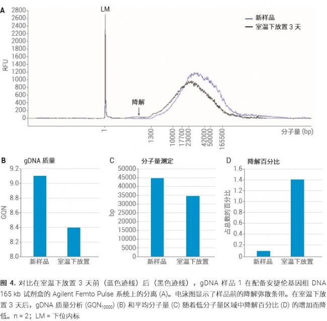 Femto Pulse 系統(tǒng)可以檢出輕微程度的降解,并反映在 GQN 中。制備好 gDNA 樣品 1 的樣品板后立即分析,然后在室溫下放置 3 天后再次分析。Femto Pulse 系統(tǒng)分離顯示樣品 1 出現(xiàn)了明顯降解,在原gDNA 條帶前方出現(xiàn)小彌散條帶,平均分子量從 44.8 kb 減小至 34.5 kb(圖 4)。