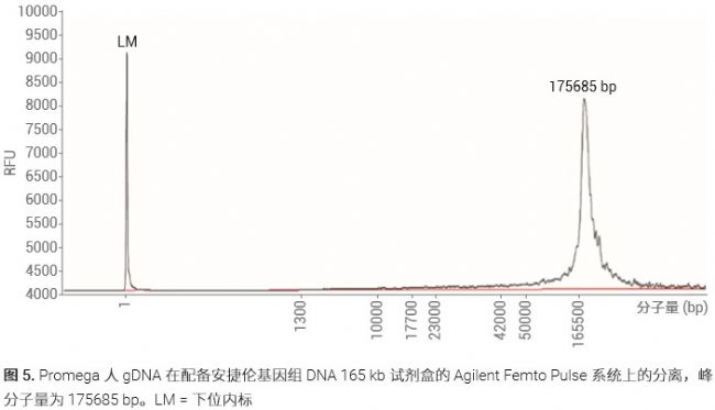[3]。在 ProSize 中,將其報告為峰分子量。在用凝膠電泳評估 DNA 完整性時,CFL 是常規(guī)報告參數(shù)。CFL 的減少變化容易檢出,并可作為物理剪切引起降解的指標。在配備安捷倫基因組DNA 165 kb 試劑盒的 Femto Pulse 系統(tǒng)上分析 Promega 人 gDNA。電泳圖顯示出 175685 bp 的尖峰,對應(yīng)為樣品的 CFL(圖 5)。并非所有樣品都能顯示出明確的 CFL,如圖 1 所示。在這種情況下,可以利用平均分子量的變化追蹤降解,而不是用最大豐度峰分子量或CFL。