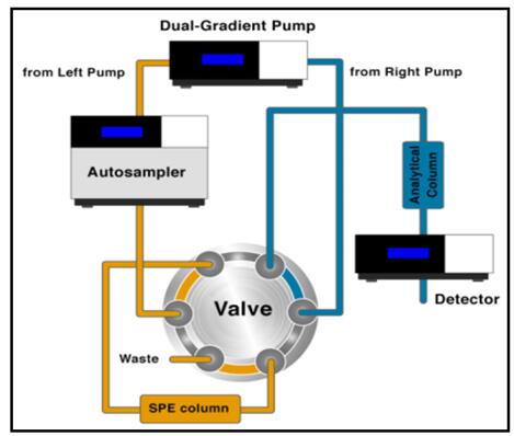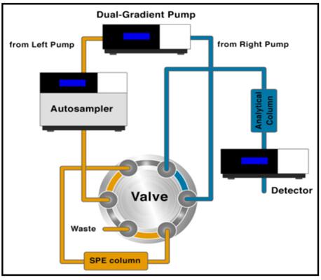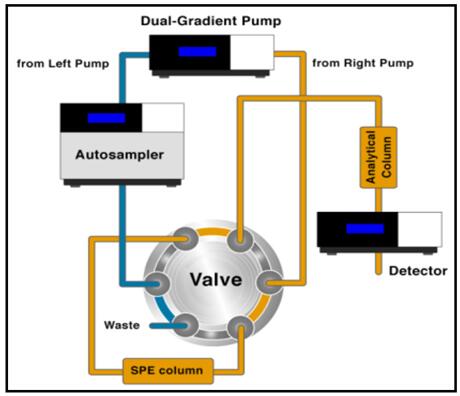 使用賽默飛雙三元液相系統(tǒng),樣品只需簡單超聲過濾即可大體積直接上樣富集、除雜、分析,整個(gè)過程全部實(shí)現(xiàn)自動(dòng)化。下面是雙三元液相在線富集、除雜、分析的自動(dòng)化工作流程: