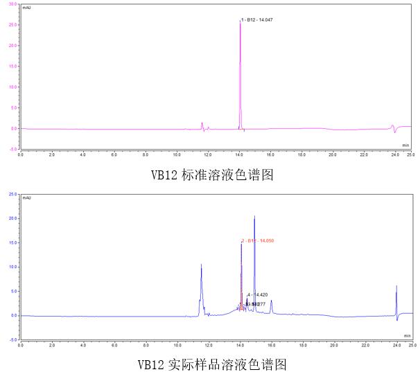 現(xiàn)行有效的國標(biāo)方法主要有“添加離子對(duì)試劑的反相高效液相色譜分析方法”以及“使用氨基柱的色譜分析方法”[2] [3],可前者見VB12的色譜保留存在難點(diǎn),離子對(duì)色譜法平衡時(shí)間較長;后者氨基柱法需特別注意柱子的使用范圍,對(duì)于習(xí)慣使用普通C18柱分析的用戶而言不太適應(yīng)。
