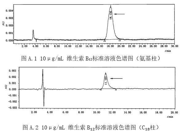 維生索B₁₂標(biāo)準(zhǔn)色譜圖(氨基柱)見圖A.1;維生素B₁₂標(biāo)準(zhǔn)色譜圖(C₁₈柱)見圖A.2。