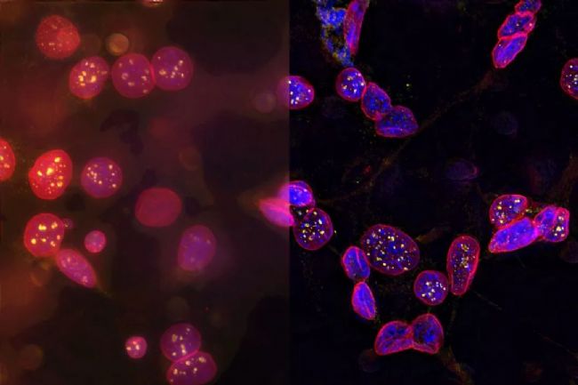 ▲ 圖 3.C2C12 細(xì)胞,品紅色核結(jié)構(gòu)支持蛋白 lamin B,藍(lán)色 Hoechst:細(xì)胞核,黃色 γH2AX:DNA 損傷,