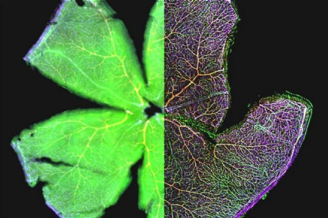 ▲ 圖 4.鼠視網(wǎng)膜:綠色抗-CD31:視網(wǎng)膜細(xì)胞,紅色 IsoB4:血管,藍(lán)色抗-GFAP:星形膠質(zhì)細(xì)胞