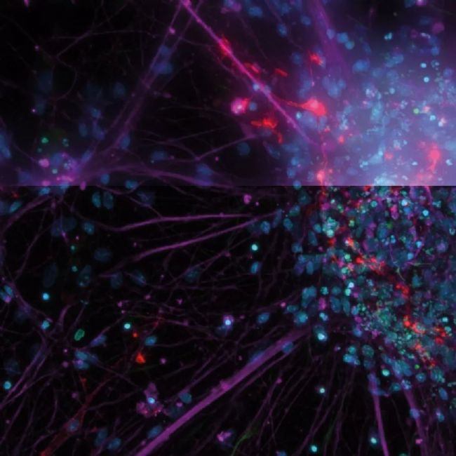 品紅色 Cy5:β-Ⅲ 微管,紅色 Rhod:NG2 蛋白,綠色 GFP:巢蛋白,藍(lán)色 DAPI