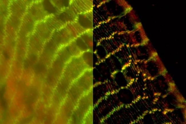 ▲ 圖 8.成鼠晶狀體縱向切片,顯示出纖維晶狀體細(xì)胞的結(jié)構(gòu) (綠色,β 連環(huán)蛋白抗體(BDB610153)), Afadin (紅色,絲狀肌動(dòng)蛋白結(jié)合抗體(PA1-25076)