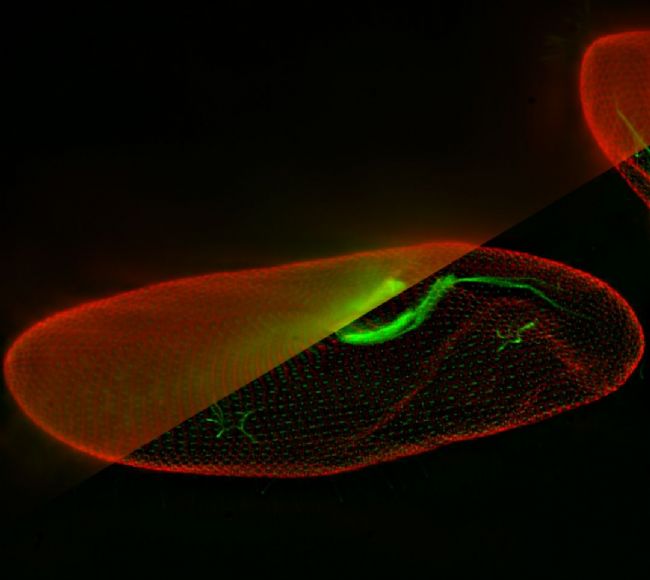 ▲ 圖 9.草履蟲。表膜蛋白(GFP,紅色顯示),β-微管蛋白(Alexa 568,綠色顯示)