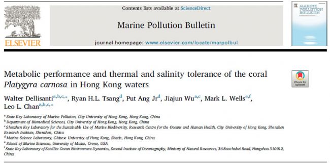 Dellisanti W, Tsang R H L, Ang Jr P, et al. Metabolic performance and thermal and salinity tolerance of the coral Platygyra carnosa in Hong Kong waters. Marine Pollution Bulletin, 2020, 153: 111005. DOI: 10.1016/j.marpolbul.2020.111005.