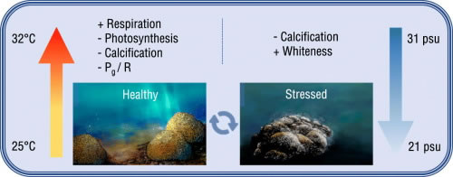 實驗表明盡管P. carnosa可以在溫度升高(25-32°C)的情況下存活,但其整體能量在溫度>30°C時嚴重降低。相反,P. carnosa對鹽度降低(31-21 psu)適應性強,但其生物鈣化率降低。表明該種珊瑚可短期適應由于降水量和降水強度的增加導致的鹽度變化。