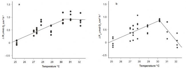 呼吸作用(R)隨溫度的升高而線性增加,從0.56 μmol O2 cm-2 h-1增加到最高1.57 μmol O2 cm-2 h-1,30°C時最高(Δ0.87±0.08 μmol O2 cm-2 h-1,p<0.01),但在30和32°C之間保持不變(Δ0.92±0.17 μmol O2 cm-2 h-1,p=0.86)。