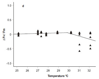 光合效率在30°C時稍有提高(Δ0.06±0.01 Fv/Fm,p<0.05),但在30°C以上,部分珊瑚片段的光合效率降低了約0.5 Fv/Fm。