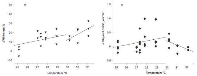 珊瑚白度的測量在所有溫度下都顯示出普遍的上升趨勢,盡管片段之間的變化較高。相比之下,鈣化速率在25到30°C之間保持不變(p=0.07),但在30到32°C之間顯著降低(Δ-79.62±34.46 μmol CaCO3 cm-2 h-1,p<0.05)。