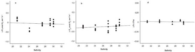 呼吸速率R、總光合速率Pg和光合效率Fv/Fm的不受鹽度變化的影響(分別為p=0.62,p=0.32和 p=0.52)。