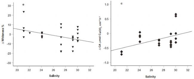 CA在最低鹽度下明顯降低(Δ-0.66±0.03 μmol CaCO3 cm-2 h-1,p<0.05),在最低鹽度水平下,珊瑚白度略有增加(Δ+7.72±5.68%,p<0.05)。