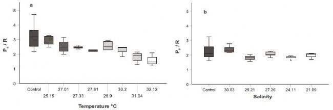 環境變化對珊瑚代謝的凈影響可表示為Pg/R,代表全功能體的代謝“健康”或狀態。在溫度效應方面,Pg/R在25-30℃的溫度范圍內穩定在~2.5~3.0之間,處于25℃的對照組測量范圍內,但隨后在30~32℃之間逐漸下降,約為對照組的一半(Δ-1.7±0.21,p<0.01;圖3a)。相比之下,盡管對照組和處理組的Pg/R值略低于幾周前溫度試驗期間測得的值(圖3b),但在整個鹽度范圍內,Pg/R沒有變化。