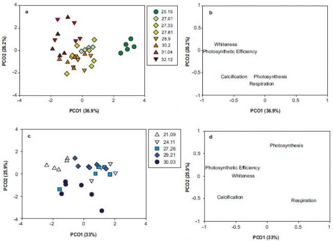 使用主坐標分析(PCoA)總結了歐氏距離。將代謝測量結果與溫度組進行了聚類。一般來說,25.15°C、27.01-28.9°C和30.2-31.12°C三組之間溫度影響顯著,這表明溫度從~27到~29°C的升高對珊瑚代謝沒有任何可檢測的影響(圖4a),類似于用Pg/R觀察到的情況。將代謝測量結果與鹽度組進行了聚類,表明鹽度降低1.25 psu/天,影響珊瑚代謝,但主要影響鈣化和白度(圖4d)。