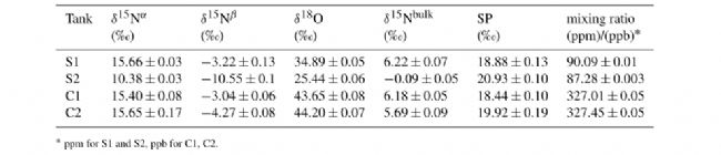 2O的摩爾分數(shù)。用合成空氣沖洗吸收池后,注入S2(校準標準)并稀釋至50ppm。為了確定已經(jīng)報告的輕微濃度依賴性,再次注入S1,但注入的摩爾分數(shù)更高,為67ppm(后來稱為S1h)。該摩爾分數(shù)表示高濃度表層空氣預濃縮后預期的摩爾分數(shù)。隨后,再次注入S1并稀釋至50ppm,然后將然后將細胞充滿預先濃縮的環(huán)境N2O(A)。注射S1和預濃縮環(huán)境N2O的子程序(S1+A)耗時35分鐘,重復三次。為了獨立測定重復性,第四個樣品是預先濃縮的壓縮空氣(目標氣體)。在實驗中,使用了兩個壓縮空氣鋼瓶(C1和C2,稱為目標氣體)。試驗開始前,在實驗室測定了兩個儲氣罐的同位素組成和N2O混合比(表1)。實驗室和現(xiàn)場分析的N2O摩爾分數(shù)和同位素組成在其分析不確定度范圍內(nèi)。