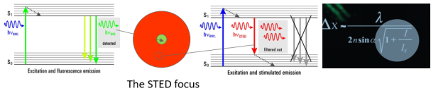 STED原理示意圖:STED通過受激發(fā)射損耗去除衍射環(huán)上的熒光信號,大大縮小有效的激發(fā)區(qū)域,從而改寫了分辨率公式,提高了光學(xué)分辨率