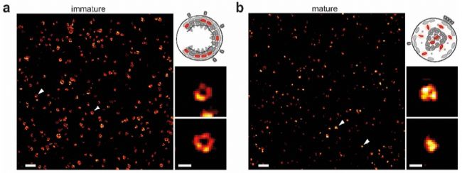 利用STED顯微鏡發(fā)現(xiàn)在HIV-1病毒成熟和未成熟條件下,可非常清晰區(qū)分其Gag蛋白的不同結(jié)構(gòu)特征。未成熟病毒的Gag蛋白呈中空環(huán)狀(圖a),而成熟病毒中呈實心固縮狀(圖b)。
