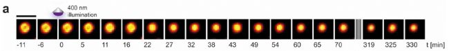 作者巧妙的利用光控方法,進(jìn)行STED時間序列成像。在400nm紫外光照后,PDI(光催化降解的蛋白酶抑制劑)降解,Gag蛋白能夠被蛋白酶水解切割,進(jìn)而病毒成熟。STED時間序列成像可輕松捕獲病毒從未成熟到成熟過程,Gag蛋白重排的結(jié)構(gòu)變化過程。