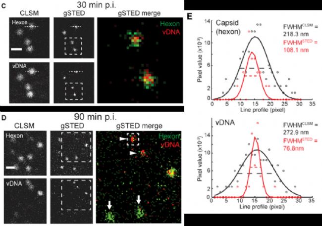 通過gated STED超高分辨顯微成像,可顯著提高分辨率,清晰呈現(xiàn)病毒衣殼和DNA的真實尺寸大小。腺病毒衣殼實際大小約80nm,gSTED顯示約110nm(包含一二抗尺寸),與實際一致。gSTED顯示被衣殼蛋白包裹的病毒DNA尺寸略小于80nm,也與衣殼尺寸符合。