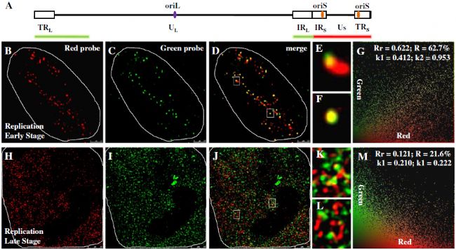 作者設(shè)計了位于HSV-1病毒基因組兩端的探針,分別以DIG(綠色)和Biotin(紅色)進(jìn)行標(biāo)記,在病毒復(fù)制的早期和晚期,分別成像觀察。STED成像發(fā)現(xiàn),在復(fù)制的早期,紅綠兩色信號的共定位程度較高;而在復(fù)制后期,兩個系數(shù)均發(fā)生了明顯降低,表明HSV-1 基因組在復(fù)制過程中經(jīng)歷了從緊湊到松弛的動態(tài)結(jié)構(gòu)變化,同時需要占用較大的空間進(jìn)行復(fù)制。