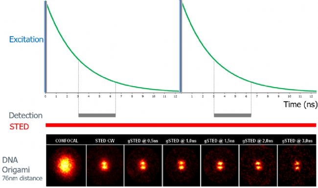 以兩個距離76nm的DNA Origami為例,gated STED在不改變STED激光功率的前提下,逐步縮小熒光壽命的檢測范圍,可逐步提高分辨率,清晰地分辨兩個點信號。