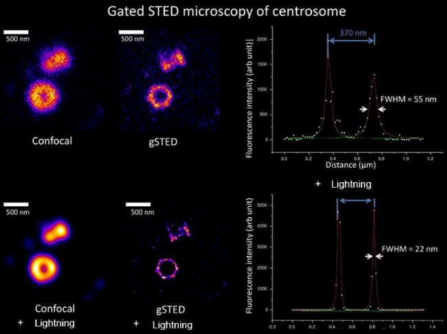 對中心粒的gated STED + Lightning成像結(jié)果,分辨率(半高寬)可達(dá)22nm!
