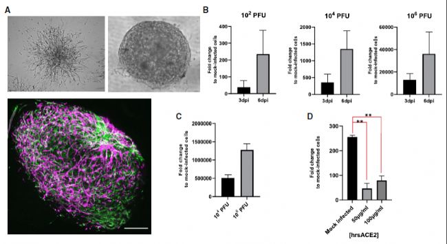 圖4 hrsACE2抑制COVID-19病毒感染血管類器官